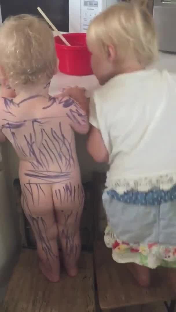 Little girl draws zebra strips all over sister