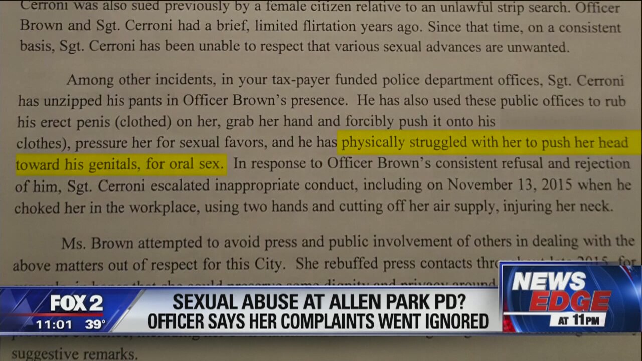 She fights crime for a career but an Allen Park police officer says she couldn't stop the violence she encountered inside her own department.