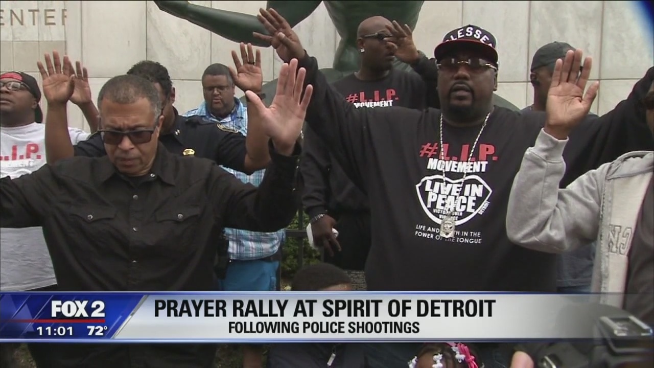 A crowd prayed at the Spirit of Detroit statue following a week of violence.