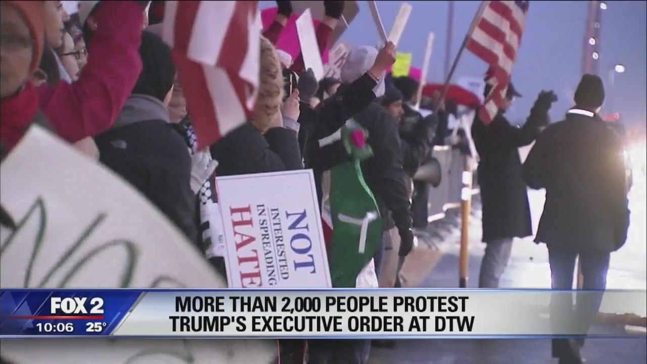 Thousands of people gathered at Detroit Metropolitan Airport on Sunday to protest President Donald Trump's executive order on immigration, which bans citizens of some Muslim-majority countries from entering the United States.