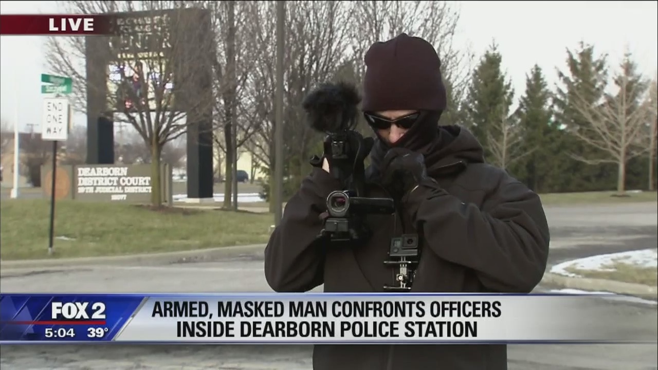 While Amy Lange wrapped up her report about two open carry advocates who entered Dearborn PD heavily armed, one of the possible suspects showed up with his own camera.