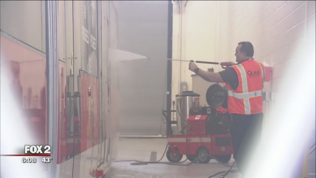 Vandals spray painted an anti-police message on a QLINE car in Detroit on Monday morning.