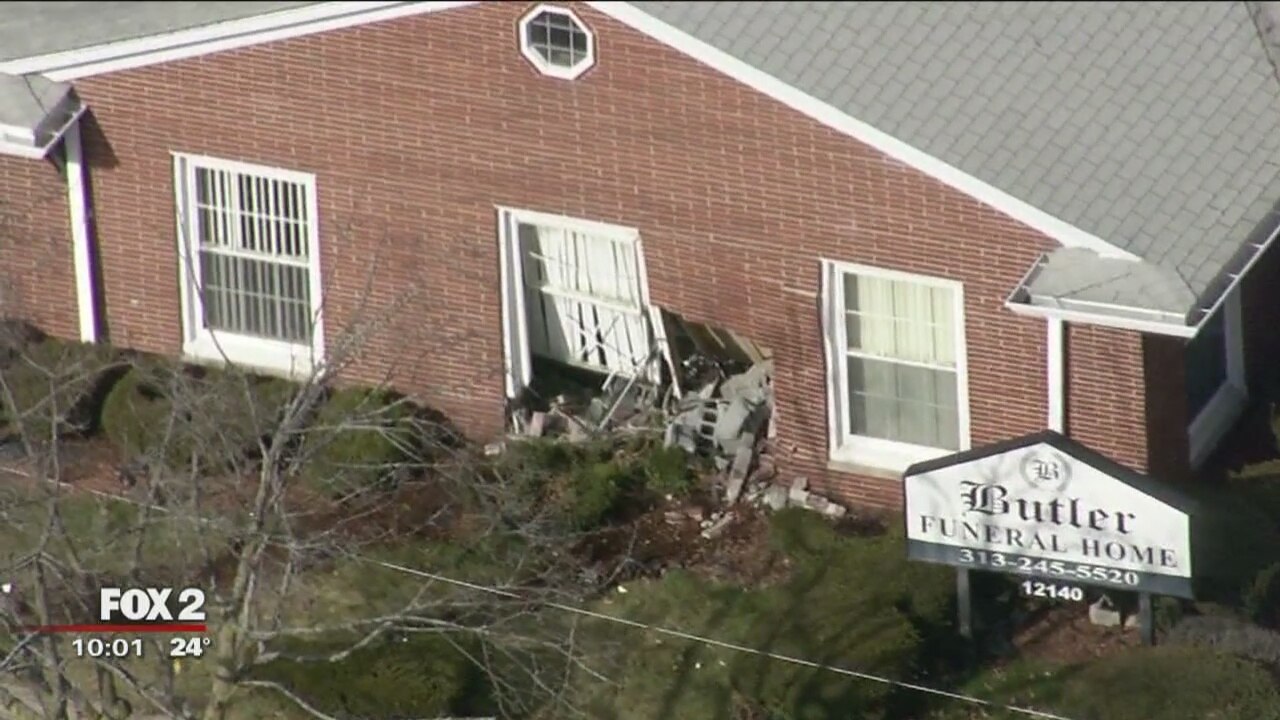 Stolen car strikes vehicle, sending it crashing into funeral home