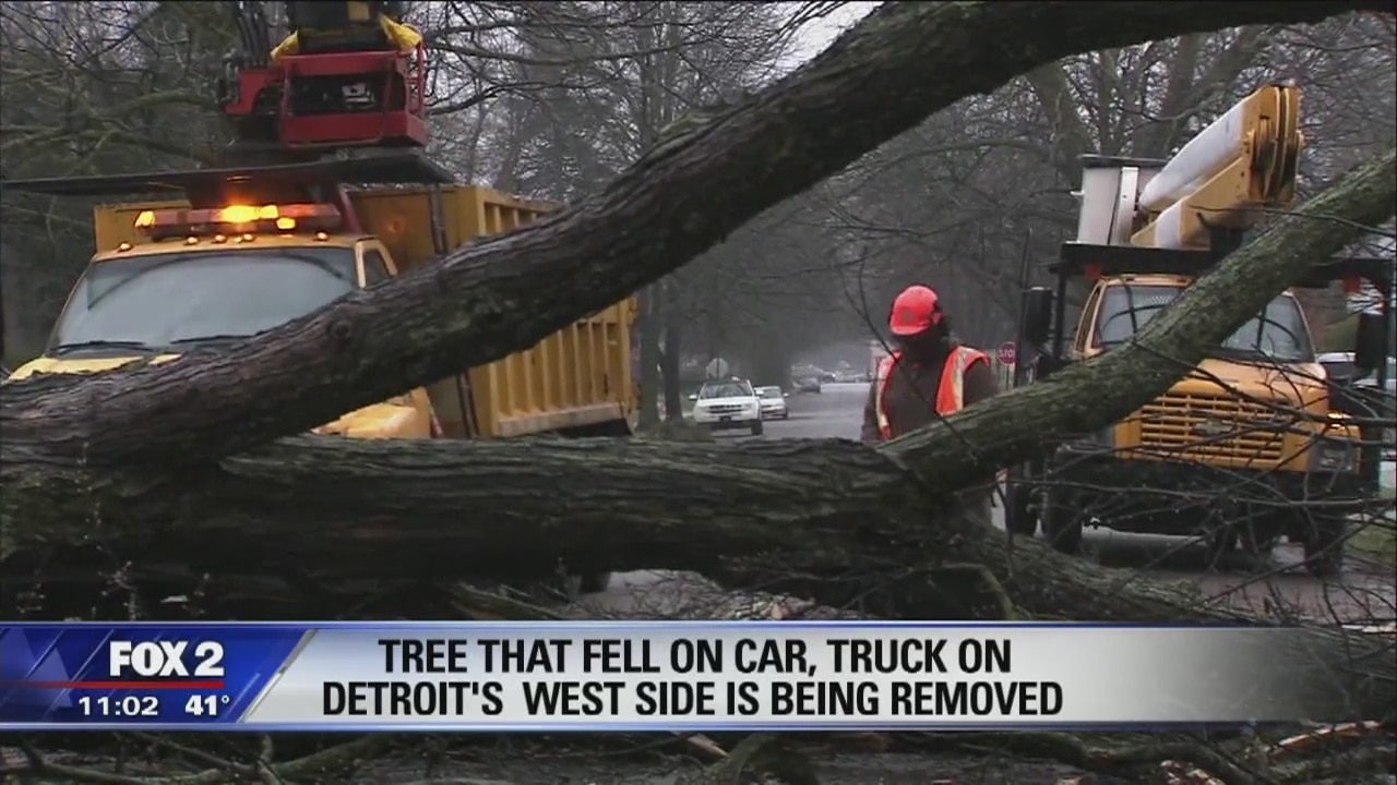 Two cars were smashed by a large tree when it fell early Thursday morning on Detroit's west side.