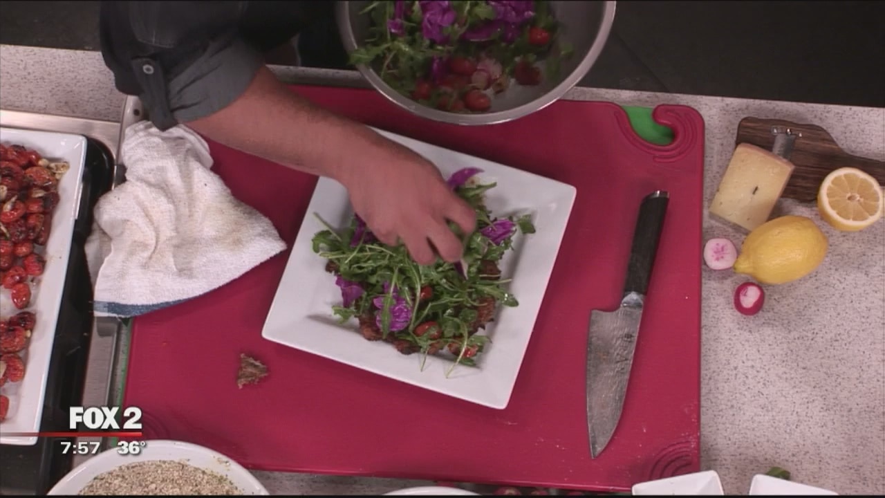 Chef Bobby makes chicken breasts with arugula salad and lemon dressing