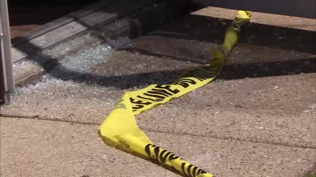 A pile of broken glass lies outside the back door of a home on the quiet street of Euclid in St. Clair Shores Thursday.