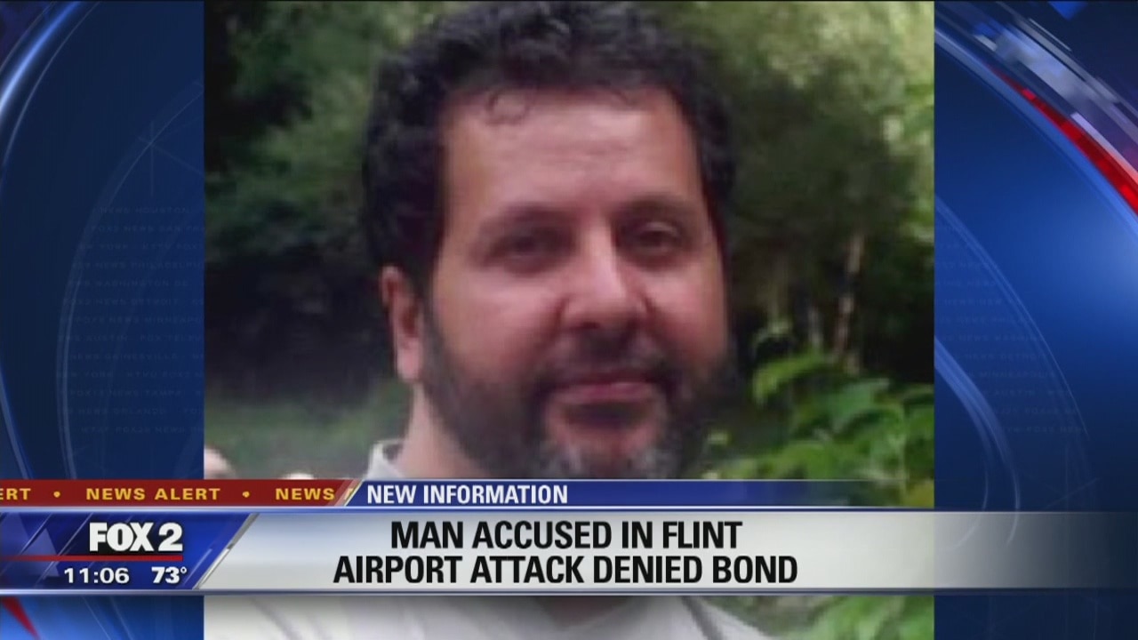 A Canadian man accused of stabbing an airport police officer in Flint, Michigan, will remain in jail while his case proceeds.