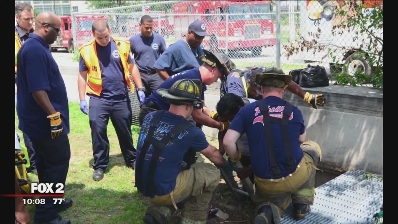 Detroit firefighters rescued a woman trapped in a hole after a grate flips up in Hart plaza.