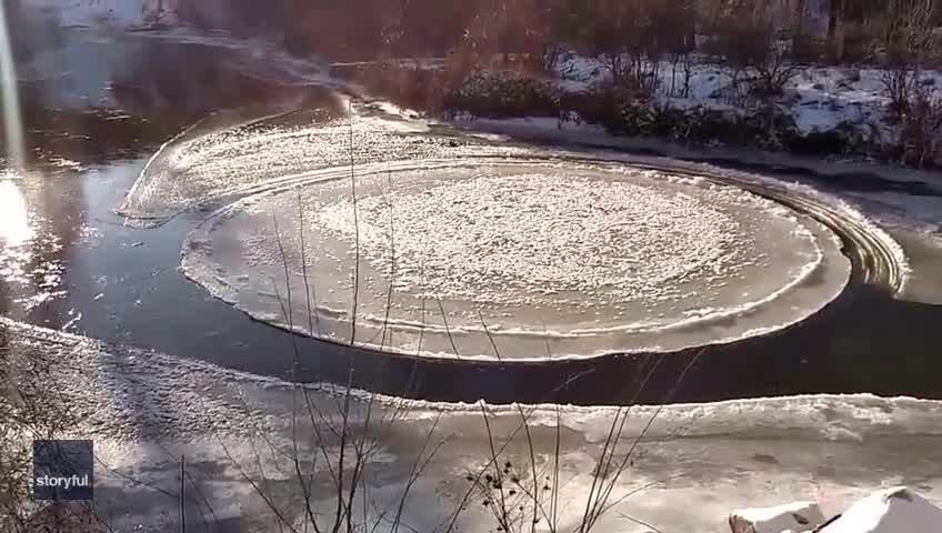 Mesmerizing ice disk forms in Michigan river like a big Lazy Susan