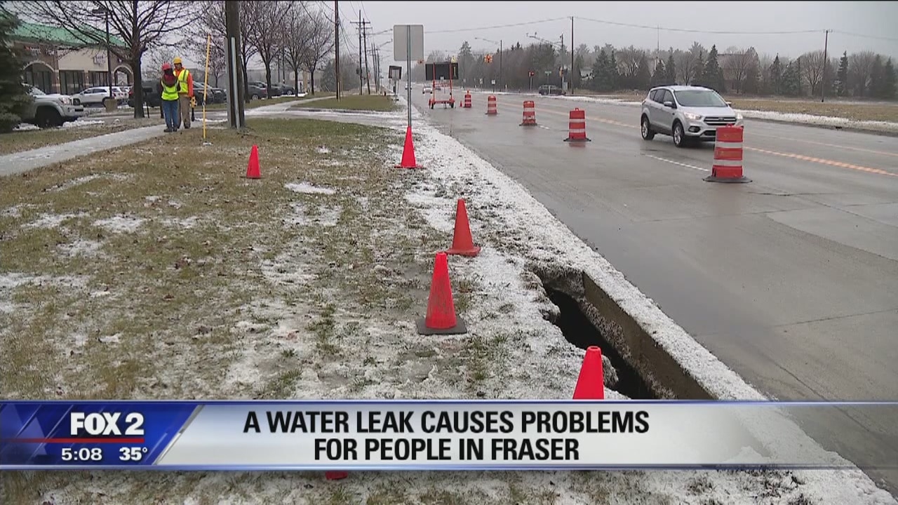 Just feet away from where a sinkhole opened up a little over a year ago, a major water leak has sprung on 15 Mile in Fraser.