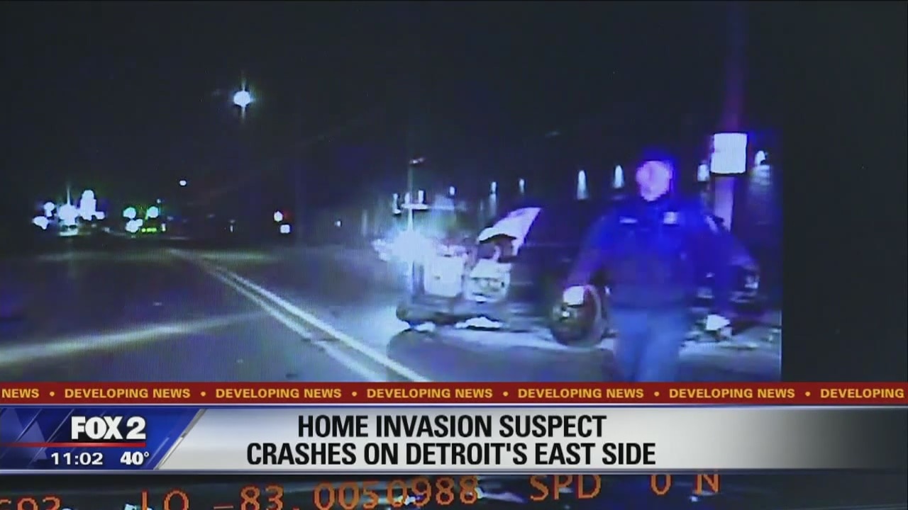 Police are looking for a home invasion suspect in Warren after a police pursuit and a crash early Wednesday morning, which sent three people to the hospital. An innocent bystander was critically injured.