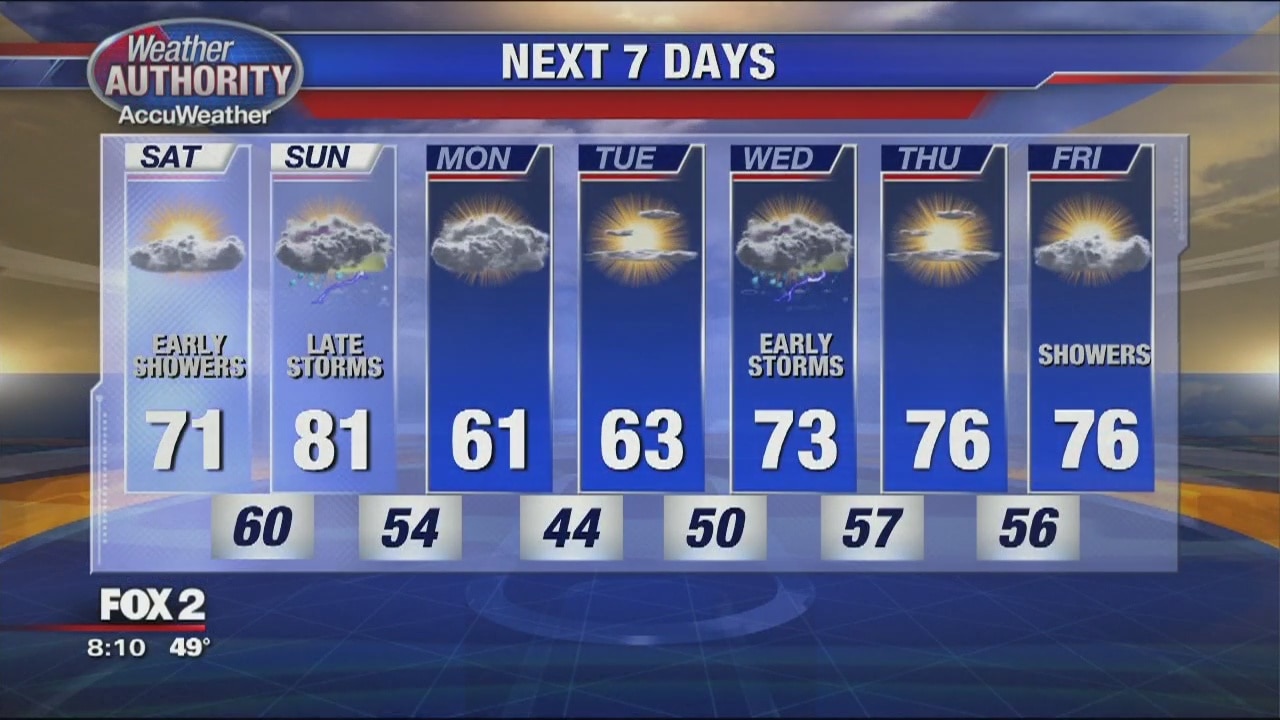 Showers exit and skies gradually clear. Temps should be close to 70.