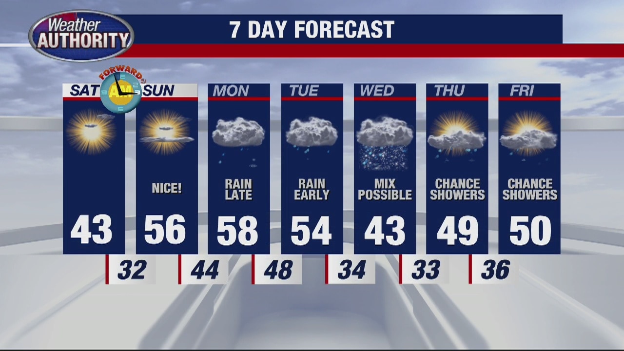 Sunshine and milder temperatures for Saturday. High - 43 degrees. Warmer still, and sunny again, for Sunday.