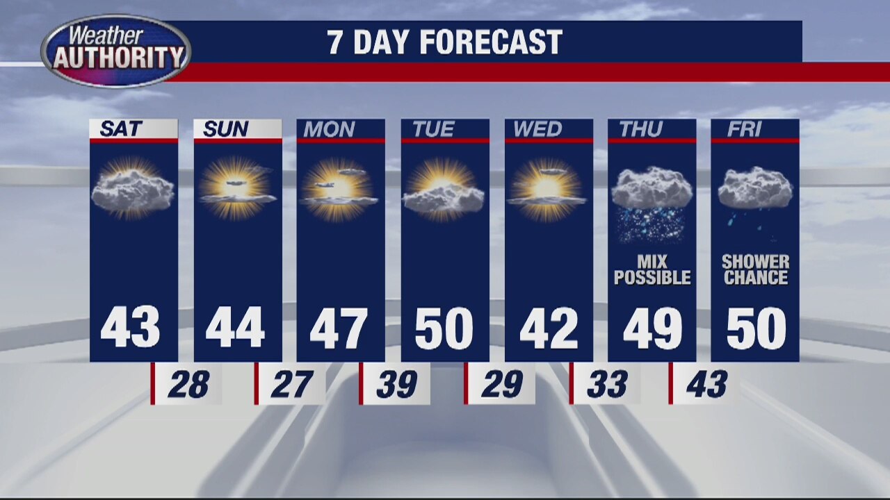 Morning sunshine will fade as clouds fill in. High temp - about 43 degrees.