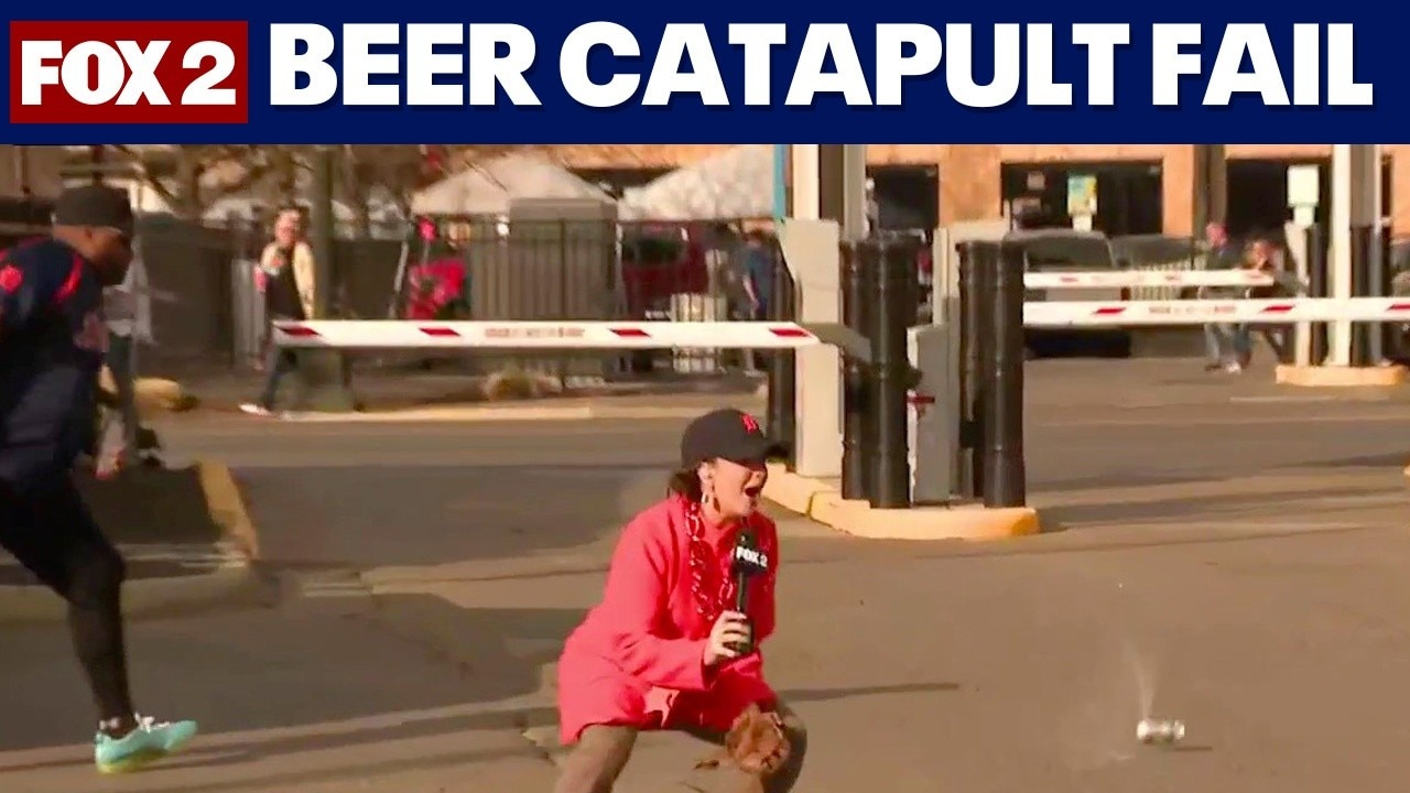 Erica Francis tried to catch a beer launched from a catapult during a Tigers Opening Day tailgate, but ended up having to run away after from a stream of beer started shooting from the can when she missed and it hit the ground.