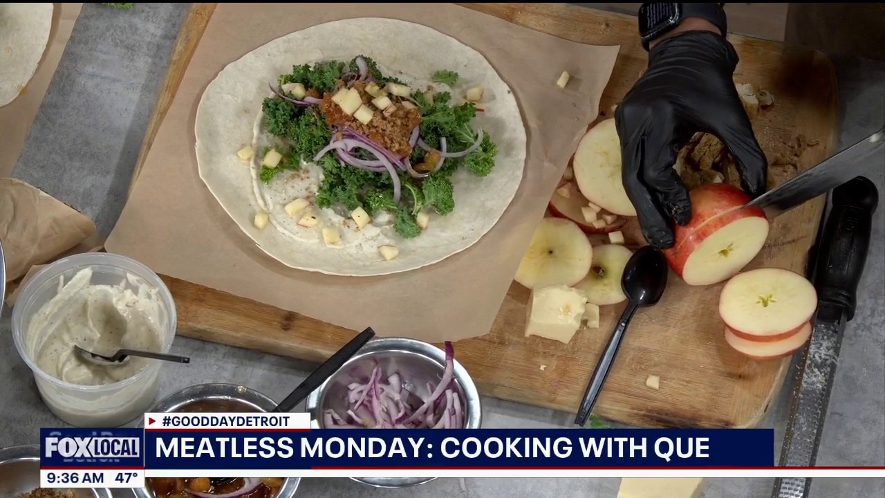 Que Rice of Cooking with Que and The Kitchen by Cooking with Que demonstrates how to make a kale Caesar wrap for Meatless Monday. The Kitchen By Cooking with Que is located at 6529 Woodward Avenue in Detroit. For more visit, thekitchenbycwq.com.