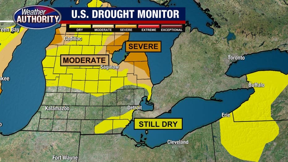 Only a swatch of southern Wayne County into portions of Monroe and Lenawee Counties still hanging onto abnormally dry conditions and moderate and severe drought conditions continuing along and north of the I-69 corridor.