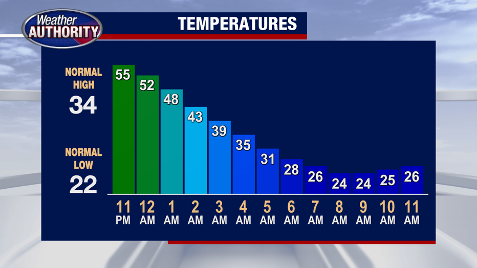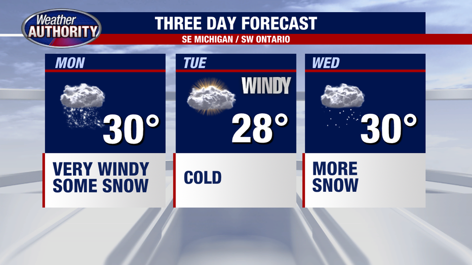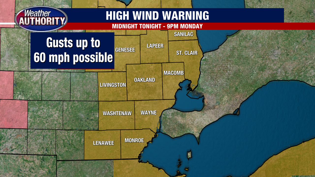 A High Wind Warning is in effect for all of southeast Michigan through the day Monday. These winds are strong enough to make travel difficult, especially for high-profile vehicles, and power outages are increasingly likely as the morning wears on. Temperatures continue to fall through the early part of the day, settling near 30 degrees and staying there for much of Monday.