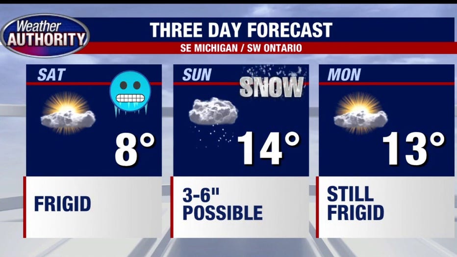 Starting Friday night, the already frigid temperatures are expected to continue with wind chills at 15 to 25 below zero, cold enough for frostbite on exposed skin in under 30 minutes. A Cold Weather Advisory is in place and will remain in effect until 10 a.m. Saturday for Southeast Michigan.