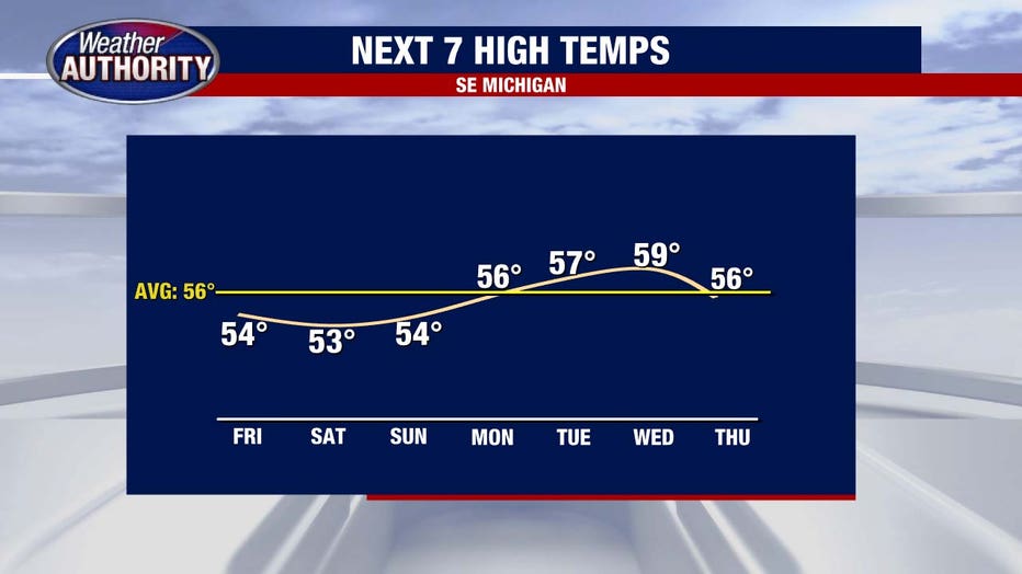 The weekend stays mainly dry as well. A few showers may pop Saturday midday, but most of the time is rain-free with temps running on the cool side.