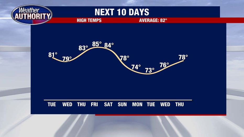 Things quiet down once we get into Tuesday night. Showers and storms move out, skies begin to clear, and lows dip to about 67 degrees. A shift in the wind out of the north will actually help dry us out a little, giving us a break from the humidity heading into Thursday.
