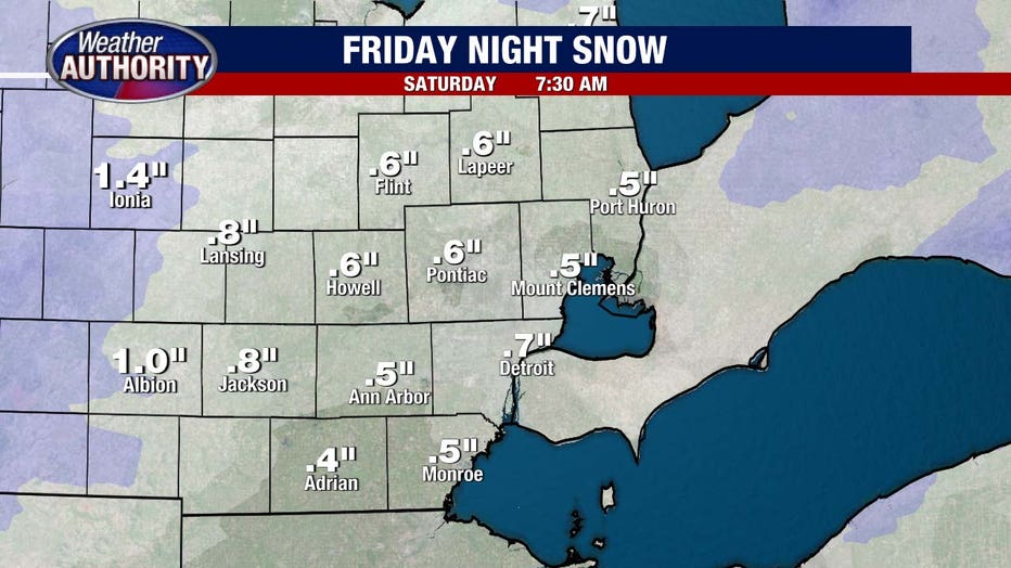 Snow sneaks back in tonight but winds down early Saturday morning and doesn’t amount to much. Totals land on either side of a half inch.