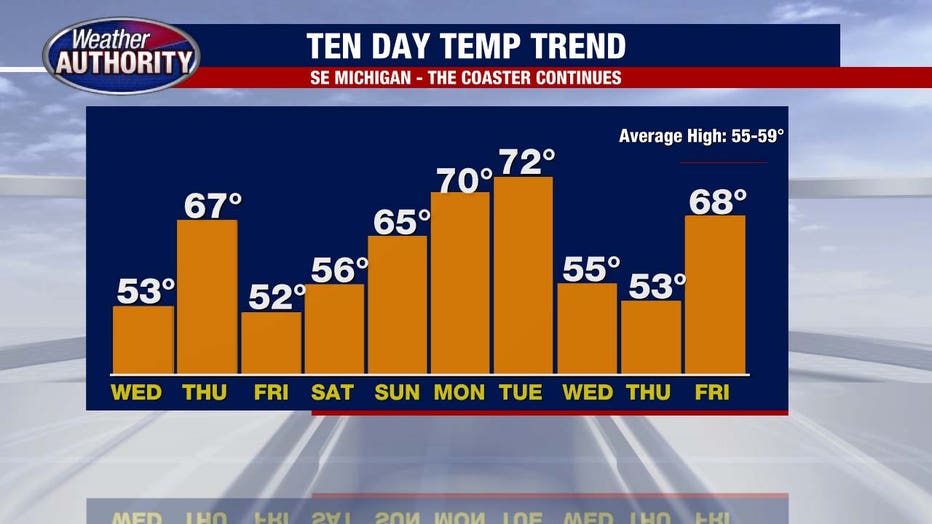 Temps keep climbing through Thursday before slipping back late in the week, but the overall up-and-down pattern sticks with us into next week though the downs generally get less extreme.