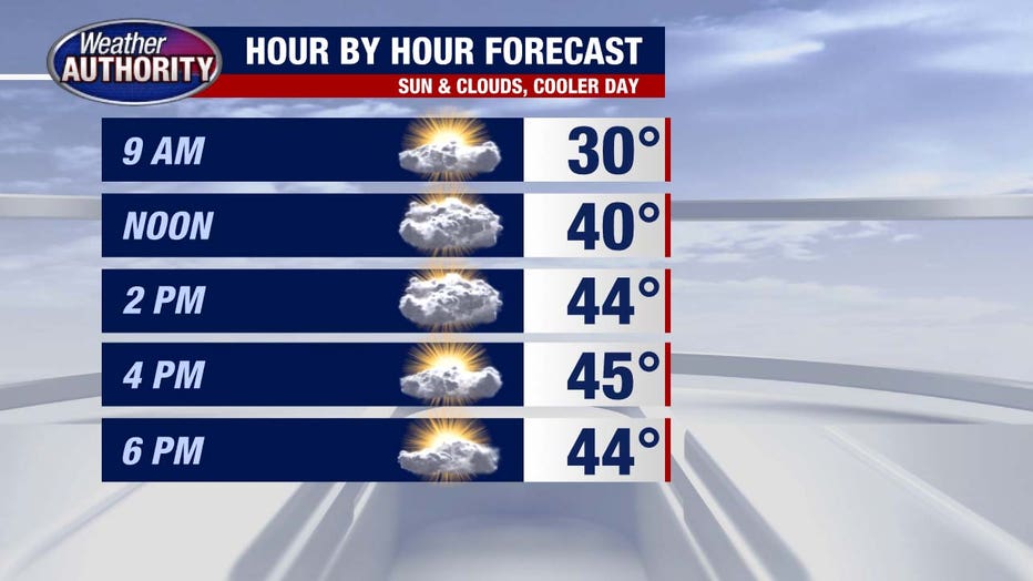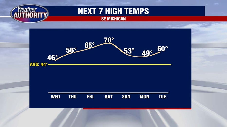 Wednesday will be the coldest day of the week, with highs in the 40s, before more warm air arrives.