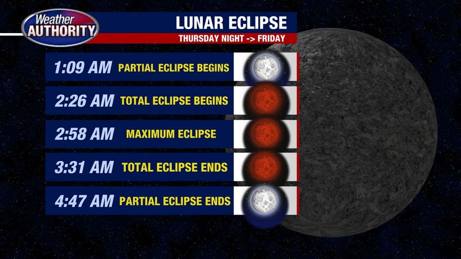 And we have a late-week lunar eclipse! Thursday night into Friday, Earth will pass between the Sun and the Moon, casting its shadow over the lunar surface. The Moon takes on a reddish hue as our atmosphere scatters sunlight, similar to a red sunrise or sunset.