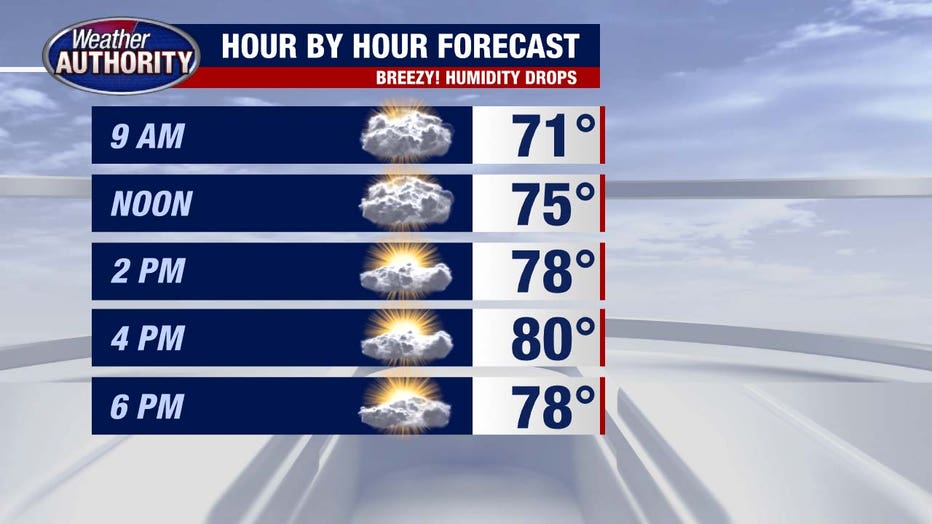 Mostly cloudy skies give way to a mix of sun and clouds this afternoon. Highs climb to around 80 with clouds in the sky, but some sun will peek through as the day progresses. Humidity takes a step back today and bottoms out Friday, giving us a brief break from the stickiness.
