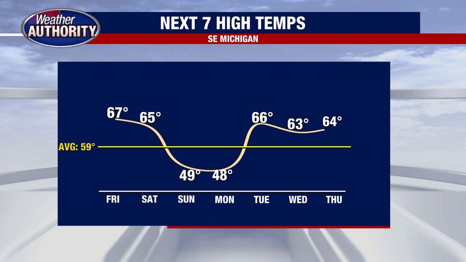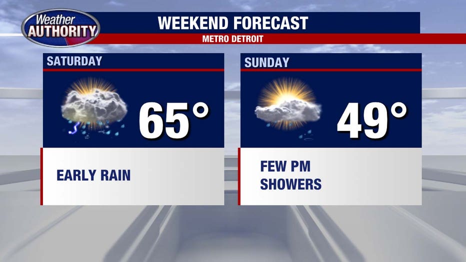 As for the weekend, a line of strong storms to our west should weaken as it moves into southeast Michigan late tonight. Showers linger into Saturday morning, then fade by midday. Spotty showers are possible Sunday too, with some snowflakes mixing in for some.