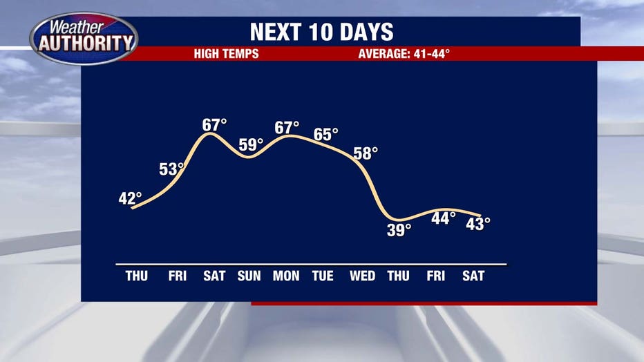 A spring feel shows up Saturday as showers and storms accompany the warmth. Sunday turns cooler but drier, and we bounce back into the 60s on Monday with the rain staying away. That warmth gives way to a cooldown late next week.