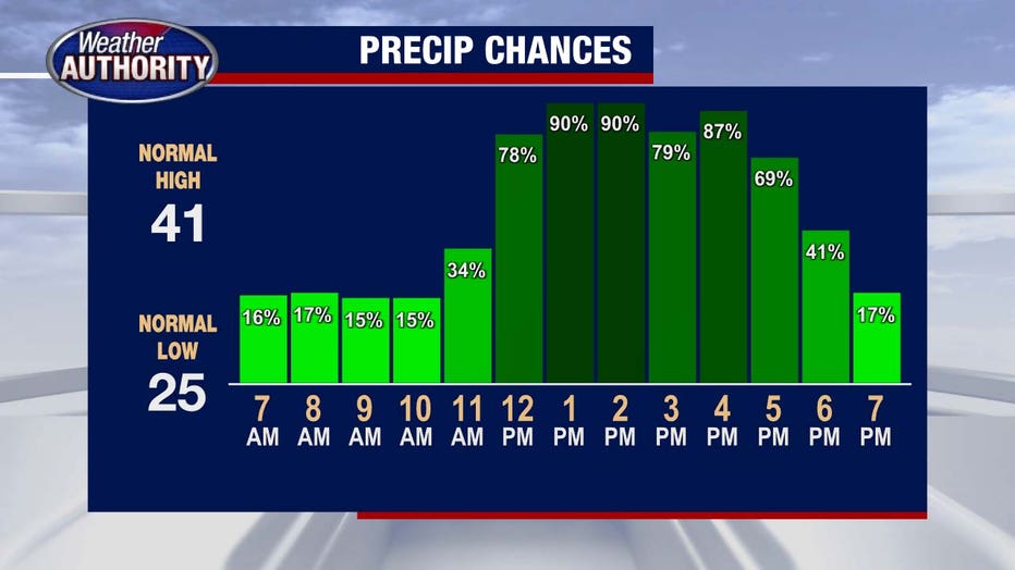 Early rain fades, but rain chances peak again late morning and into the afternoon. All the while we’ll be dealing with patchy fog and temps struggling to make it out of the 30s.