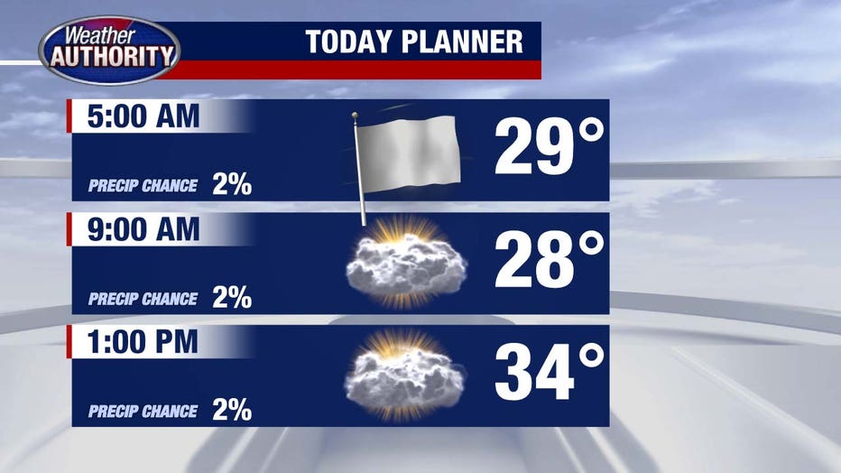 We’ll top out near 39 with a mix of clouds and sunshine, and the afternoon brings the best chance to see some blue sky. The catch is the wind. A steady west breeze at 15 to 25 miles per hour will knock down the comfort level, keeping it feeling more like the upper 20s for much of the day.