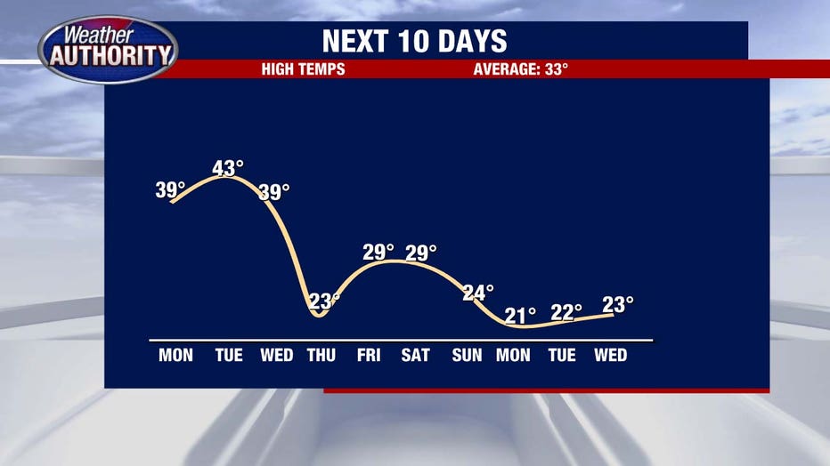 Wednesday is the turning point. A strong cold front arrives late in the day, sending temperatures from the upper 30s crashing into the teens overnight. Along the way, precipitation may start as a wintry mix before flipping over to snow. By Thursday morning, an inch of accumulation is possible.