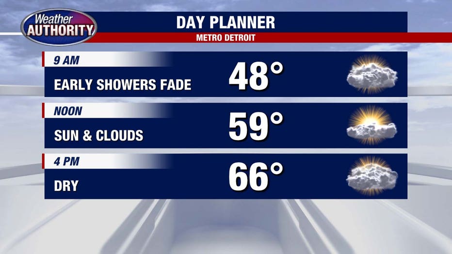 After the early showers fade, the area will see a mix of sun and clouds with highs in the mid-60s.