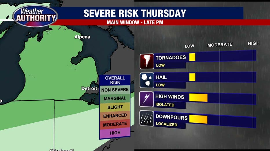 Severe weather isn’t a slam dunk, but a Marginal Risk is in place for an isolated damaging wind gust around 60 mph or localized flooding.