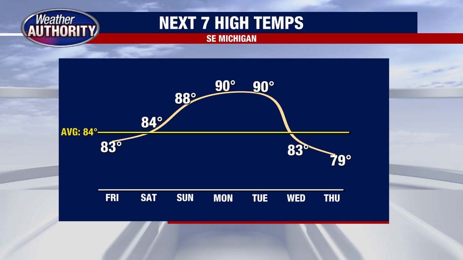 We’ll dry out by Sunday, with temps aiming for 90° by Monday and Tuesday.