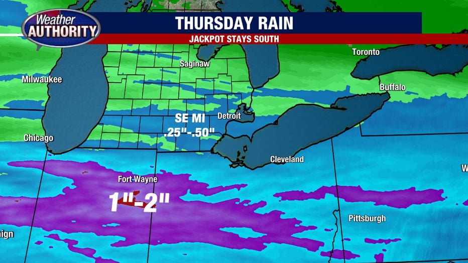 Most of us pick up 0.25" to 0.50", though localized higher amounts are possible. The bigger rainfall bullseye stays south of Michigan.