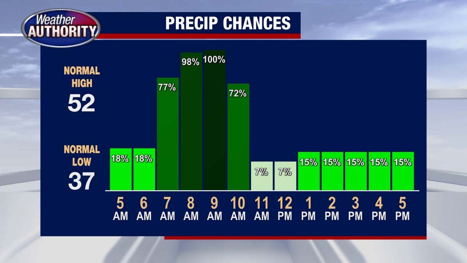 Rain moves in early and winds down by lunch, with the rest of the day trending drier.