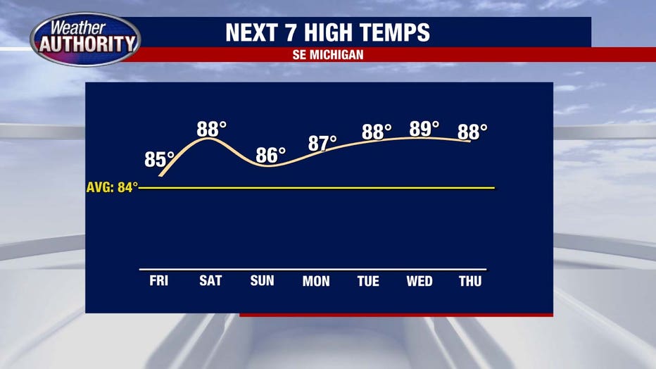 The Sunday dip is brief with the upper 80s hanging through the bulk of next week.