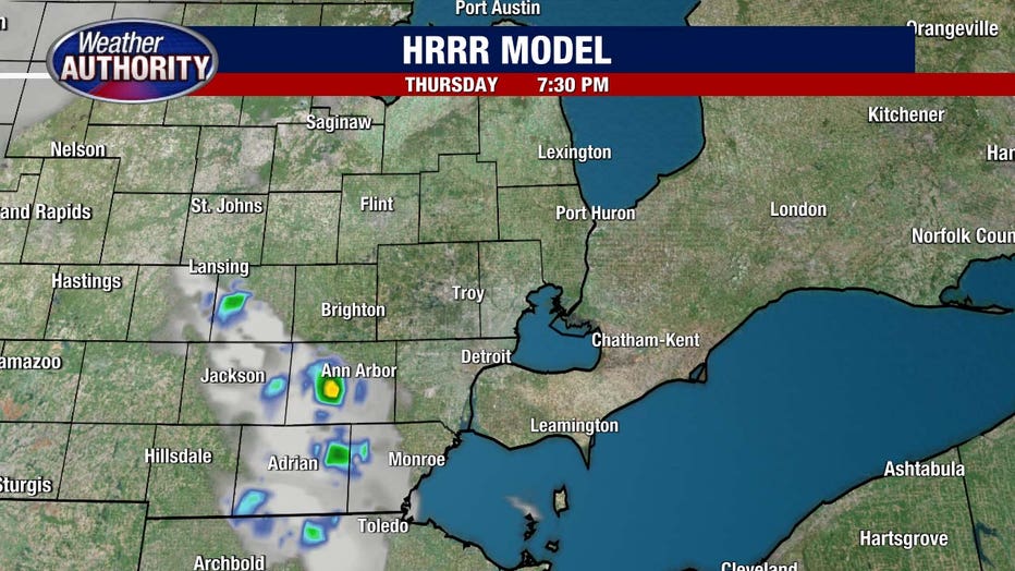 Here’s a look at late afternoon and evening. I’d favor areas from Detroit to Ann Arbor, and points south and west, to catch a storm, but it’s possible anywhere.