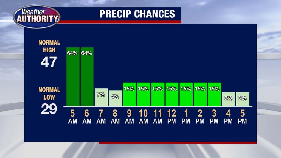 There’s an outside chance for a few light showers this morning, and with temps near freezing, any rain could create a brief slick spot or two. Any potential impacts should be short-lived though, as temps rise quickly.