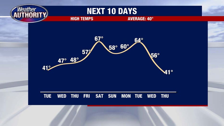 Then comes the bigger shift. Friday and Saturday surge well above normal with highs pushing into the mid and even upper 60s. It will feel dramatically different compared to how we’re starting this week.