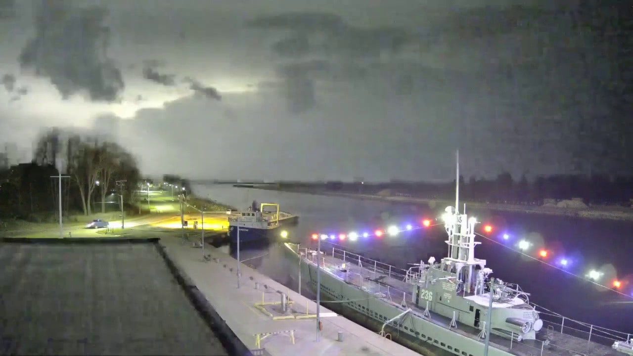 Lightning can be seen as severe weather enters the west side of Michigan through Muskegon