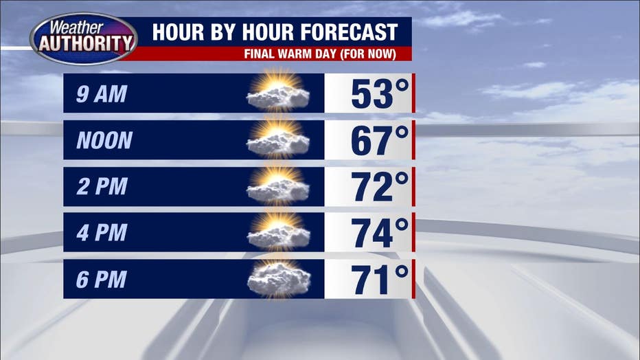 One last day in the 70s before temperatures fall and rain arrives Tuesday night