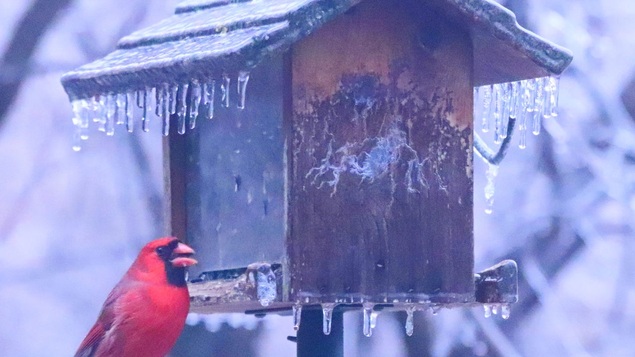 Photo courtesy of Jim Ireton in Brighton of an ice-covered bird feeder, with icicles forming on the roof and perch. It was taken Dec. 26, during an ice storm.